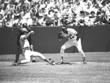 McCovey was not the only first baseman on the Giants. First base was also the natural position of Orlando Cepeda, who had won the NL Rookie of the Year Award the year before McCovey and played about 60 games at the position in 1959 when McCovey was in the minor leagues. However, new manager Alvin Dark declared McCovey his first baseman for 1961, putting Cepeda in right field to begin the year.[14] Dark also assigned Willie Mays as McCovey's roommate.[15]