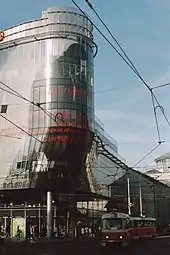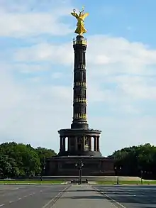 Filming took place at actual locations in West Berlin, such as the Siegessäule, Hans Scharoun's Berlin State Library,[25] Potsdamerplatz with the disused elevated track of the M-Bahn, the Lohmühlenbrücke, the Langenscheidtbrücke (the motorcycle accident), Oranienstrasse, Goebenstrasse 6 (where Damiel exchanges his breastplate for a loud check jacket), Waldemarstrasse (where Damiel comes to as a human), Günzelstrasse U-Bahn station, the Anhalter Bahnhof, Theodor-Wolff-Park (site of the circus), Hochbunker Pallasstrasse (Peter Falk's film set) and the Hotel Esplanade (the concert). Most shots of the Wall are genuine, although the set for the scene in the death strip, in which Damiel announces his decision to become human, was specially built.[25] Some pieces of the recreation were made from inexpensive wood, with one being destroyed by rain during production.[19]