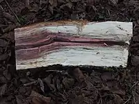 Natural durability is the inherent capability of wood to tolerate and resist fungal decay and insect attacks, such as woodboring beetles and termites, and marine organisms.[45] This protective feature is attributable to specific biological compounds, called extractives that are toxic to wood-destroying organisms. Along with the tree’s growth, the sapwood converts into heartwood and this brings physical and chemical changes to the wood.[46] As a result, the permeability decreases while the natural durability increases. Thus, the extractives responsible for natural durability are mainly present in the heartwood, although they may also be contained in small amounts in the sapwood.[47] Different chemicals have been isolated from the heartwood of naturally rot-resistant trees and have shown to be protectants, including polyphenols, lignans (e.g. gmelinol, plicatic acid), flavonoids (e.g. mesquitol), tropolones (e.g. hinokitiol and other thujaplicins), sesquiterpenoids (e.g. α-cadinol).[48][49] The natural durability varies between tree species, geographic regions, environmental conditions, growth stage, and increases with the age. Thereby, some trees are more resistant to fungal diseases and insects and their timber lasts longer than other trees. Notably, the timber of these trees remain durable for a long-time period, even around a century, thereby they have been used as a reliable building material for centuries. Since the young trees do not produce enough protecting chemicals, some trees grow with a hollow, rotten trunk at an early age.[50] However, the stands of old-growth trees are more naturally durable than second-growth stands.[51] Tree species that have significant natural durability include Lagarostrobos franklinii (Huon pine), Intsia bijuga (ipil), some Eucalyptus species (ironbark), Podocarpus totara (totara), Vitex lucens (puriri), Agathis australis (kauri), and trees of the Cupressaceae family, such as Chamaecyparis obtusa (Hinoki cypress), Thuja plicata (Western red cedar), Thujopsis dolabrata (Hinoki asunaro), Juniperus cedrus (Canary Islands juniper), Cedrus atlantica (Atlas cedar), Chamaecyparis taiwanensis (Taiwan cypress), among others.[52]