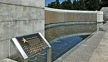 On May 23, 2013, Senator Rob Portman introduced the World War II Memorial Prayer Act of 2013 (Pub. L.Tooltip Public Law (United States) 113–123 (text) (PDF)), which would direct the Secretary of the Interior to install at the World War II memorial a suitable plaque or an inscription with the words that President Franklin D. Roosevelt prayed with the United States on June 6, 1944, the morning of D-Day.[36] The bill was opposed by the American Civil Liberties Union, the American Jewish Committee, Americans United for Separation of Church and State, the Hindu American Foundation, and the Interfaith Alliance.[37] Together the organizations argued that the bill "endorses the false notion that all veterans will be honored by a war memorial that includes a prayer proponents characterize as reflecting our country's 'Christian heritage and values.'"[37] The organizations argued that "the memorial, as it currently stands, appropriately honors those who served and encompasses the entirety of the war" and was carefully created, so no additional elements, such as FDR's prayer, need to be added.[37] But, they said, "the effect of this bill, however, is to co-opt religion for political purposes, which harms the beliefs of everyone."[37] The bill was signed into law on June 30, 2014,[38] and the Commission of Fine Arts preferred a design at the Circle of Remembrance to the northwest of the memorial.[39] With funding secured, it was initially intended to be dedicated on June 6, 2022,[40] but was instead opened a year later on June 6, 2023 on the 79th anniversary of the Normandy landings.[41]