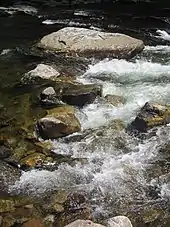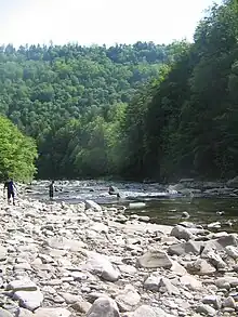 Edward Gertler, author of Keystone Canoeing, writes that Loyalsock Creek's "exciting whitewater, above Forksville, has long been a favorite of paddlers who are quick and tolerant enough to endure its fickle water levels and weather".[74] This is the stretch of the creek in and near the park, whose "long, steepening, and complex boulder patch and ledgy rapids demand your attention ... A boater's chute through the middle of the swimming area dam at Worlds End State Park climaxes this run".[74]