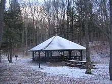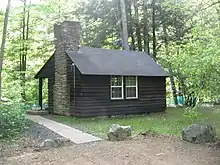 In 1987 the CCC architecture earned the Worlds End State Park Family Cabin District within the park a listing on the National Register of Historic Places (NRHP).[3][26] The 18.4-acre (7.4 ha) historic district includes nineteen cabins and three latrines built by the CCC between 1933 and 1941.[27] Seven of the cabins have one room, nine have two rooms, and three have three rooms.[28] There are also three modern latrines within the district which are designated as non-contributing structures.[27] The historic structures are examples of CCC work that reflects the standards set forth by the Department of the Interior. The cabins and latrines are constructed with native stones and timber and are placed on the land in a way that minimizes interference with the natural surroundings of the park.[27]