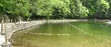 The picnic and swimming areas are adjacent to each other, with the building housing the bath house and concession stand between them. There are many picnic tables and several pavilions available for day use by visitors to the park. During the Great Depression the Civilian Conservation Corps built a 7-foot (2.1 m) tall dam on Loyalsock Creek, which provides a 1 acre (0.40 ha) swimming area at Worlds End State Park.[2][77] Since 2008, lifeguards are no longer on duty at the park.[78]