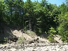 By the mid-19th century, the demand for lumber reached the area, where eastern white pine and eastern hemlock covered the surrounding mountainsides. Lumbermen came and harvested the trees and sent them down Loyalsock Creek to the West Branch Susquehanna River and to sawmills there. The old-growth forests of eastern white pine and eastern hemlock were soon clearcut and the hills were stripped bare. Nothing was left except the dried-out tree tops, which became a fire hazard, so much of the land burned and was left barren. In the 1920s a sawmill was built on land now in the park, and two more were located about 1 mile (1.6 km) south.[3][6][19] After it was "thoroughly logged", the area became a tangle of briars and brush.[6]