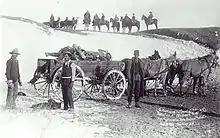 After being called to the Pine Ridge Agency, Spotted Elk of the Miniconjou Lakota nation and 350 of his followers were making the slow trip to the agency on December 28, 1890, when they were met by a 7th Cavalry detachment under Major Samuel M. Whitside southwest of Porcupine Butte. John Shangreau, a scout and interpreter who was half Lakota, advised the troopers not to disarm the Lakota immediately, as it would lead to violence. The troopers escorted the Native Americans about five miles (eight kilometers) westward to Wounded Knee Creek where they told them to make camp. Later that evening, Colonel James W. Forsyth and the remainder of the 7th Cavalry arrived, bringing the number of troopers at Wounded Knee to 500.[33] In contrast, there were 350 Lakota: 230 men and 120 women and children.[14] The troopers surrounded Spotted Elk's encampment and set up four rapid-fire Hotchkiss-designed M1875 mountain guns.[34]