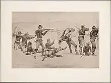 Company K of the 7th Cavalry—the unit involved at Wounded Knee—was sent to force the Lakotas to return to the areas they were assigned on their respective reservations. Some of the "hostiles" were Brulé Lakota from the Rosebud Indian Reservation. Company K was pinned down in a valley by the combined Lakota forces and had to be rescued by the 9th Cavalry, an African American regiment nicknamed the "Buffalo Soldiers".[67]