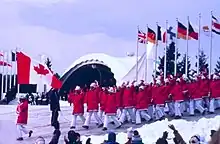 The Lake Placid Games took place in the shadow of the Cold War with a number of other complex international events occurring in the lead up to the games. In November 1979, Sixty-two Americans were taken hostage at the United States Embassy in Tehran by Iranian militants, a situation that would not resolve until after the Games.[15] In December 1979, the Soviet Union began the invasion of Afghanistan, which led to United States President Jimmy Carter calling for the international boycott of the 1980 Summer Games in Moscow.[15] The Western governments first considered the idea of boycotting the Moscow 1980 Summer Olympics in response to the situation in Afghanistan at the 20 December 1979 meeting of NATO representatives. The idea was not completely new to the world: in the mid 1970s, proposals for an Olympic boycott circulated widely among human rights activists and groups as a sanction for Soviet violations of human rights.[16] At that time, very few member governments expressed interest in the proposal. However, this idea gained popularity in early January 1980 when Soviet nuclear scientist and dissident Andrei Sakharov called for a boycott. On 14 January 1980, the Carter Administration joined Sakharov's appeal and set a deadline by which the Soviet Union must pull out of Afghanistan or face the consequences, including an international boycott of the games. On 26 January 1980, Canadian Prime Minister Joe Clark announced that Canada, like the US, would boycott the Olympic Games if Soviet forces did not leave Afghanistan by 20 February 1980.[17] Carter also proposed moving the Olympics to Greece on a permanent basis to eliminate the issue of politicisation of the Games' hosting, but the International Olympic Committee (IOC) rejected this idea.[18] Ultimately, 66 nations would boycott the 1980 Summer Olympics, but this did not impact the Lake Placid Games.