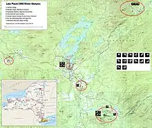 The construction was financed by the Federal government and the State of New York at a total cost of $92 million[28] including $22.7 million for the Olympic Village, $16.9 million for the Olympic Center, more than $15 million for the alpine ski center of Whiteface Mountain, $7.9 million for the facilities of Mont Van Hoevenberg (cross-country skiing, bobsleigh and biathlon), $5.4 million for the ski jumps and $5.3 million for the bobsled run. Additional costs included transport improvements totaling $4.8 million, the extension of the electricity and hydroelectric network at $2.7 million, and construction for the headquarters of the New York State Police at $3.8 million. In addition, $8 million was allocated for security costs. The expenses of the organizing committee were mainly administrative totaling $48.1 million, and for press and broadcasting centers.[29][30][27]