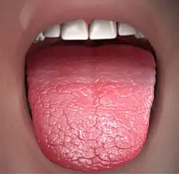 Xerostomia, also known as dry mouth,[1] is dryness in the mouth, which may be associated with a change in the composition of saliva, or reduced salivary flow, or have no identifiable cause.