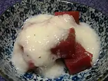Mountain yam is eaten raw and grated, after only a relatively minimal preparation: the whole tubers are briefly soaked in a vinegar-water solution to neutralize irritant oxalate crystals found in their skin. The raw vegetable is starchy and bland, mucilaginous when grated, and may be eaten plain as a side dish, or added to noodles.