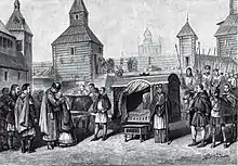 During the next four years Yaroslav waged a complicated and bloody war for Kiev against his half-brother Sviatopolk I of Kiev, who was supported by his father-in-law, Duke Bolesław I the Brave (King of Poland from 1025).[10] During the course of this struggle, several other brothers (Boris, Gleb, and Svyatoslav) were brutally murdered.[10][11] The Primary Chronicle accused Sviatopolk of planning those murders.[10] The saga Eymundar þáttr hrings is often interpreted as recounting the story of Boris' assassination by the Varangians in the service of Yaroslav.
