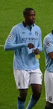 Touré aspired to be a striker during his youth[4] and has played centre-back, including for Barcelona in the 2009 UEFA Champions League final.[5] However, he spent the majority of his career as a box-to-box midfielder for club and country, where he has been regarded as one of the world's best players in his position.[6] One of the greatest African players of all time, Touré was voted African Footballer of the Year for 2011, 2012, 2013 and 2014.[7][8]