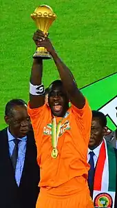 Touré represented the Ivory Coast at six Africa Cup of Nations tournaments, in 2006, 2008, 2010, 2012, 2013 and 2015; his side ended as runners-up in the 2006 and 2012 editions, and won the tournament in 2015. Touré was named in the CAF's team of the tournament in 2008, 2012 and 2015.[80] On 4 February 2015, Touré scored the opening goal in the Ivory Coast's 3–1 semi-final victory over DR Congo to qualify the team for their third Africa Cup of Nations final in nine years.[81] On 8 February, in the final held at the Estadio de Bata in Equatorial Guinea, Touré captained the Ivory Coast as they won a first AFCON title since 1992, defeating Ghana in a penalty shoot-out.[82]