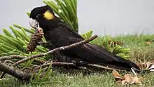 The diet of the yellow-tailed black cockatoo is varied and available from a range of habitats within its distribution, which reduces their vulnerability to degradation or change in habitat.[41] Much of the diet comprises seeds of native trees, particularly she-oaks (Allocasuarina and Casuarina, including A. torulosa and A. verticillata), but also Eucalyptus (including E. maculata flowers and E. nitida seeds), Acacia (including gum exudate and galls), Banksia (including the green seed pods and seeds of B. serrata, B. integrifolia, and B. marginata), and Hakea species (including H. gibbosa, H. rugosa, H. nodosa, H. sericea, H. cycloptera, and H. dactyloides). They are also partial to pine cones in plantations of the introduced Pinus radiata and to other introduced trees, including Cupressus torulosa, Betula pendula and the buds of elm Ulmus species.[42][43] In the Eyre Peninsula, the yellow-tailed black cockatoo has become dependent on the introduced Aleppo pine (Pinus halepensis), alongside native species.[44] Nectar is also included in the diet[25] such as that from native shrubs including Grevillea sp. and Lambertia formosa.