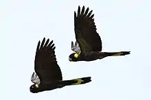 The yellow-tailed black cockatoo is distinguished from other dark-plumaged birds by its yellow tail and ear markings, and its contact call.[5] Parts of its range overlap with the ranges of two cockatoo species that have red tail banding, the red-tailed cockatoo and the glossy black cockatoo.[22] Crow species may appear similar when seen flying at a distance; however, crows have shorter tails, a quicker wing beat, and different calls.[23]