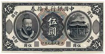 The Yellow Emperor continued to be revered after the Xinhai Revolution of 1911, which overthrew the Qing dynasty. In 1912, for instance, banknotes carrying Huangdi's effigy were issued by the new Republican government.[96] After 1911, however, the Yellow Emperor as national symbol changed from first progenitor of the Han race to ancestor of China's entire multi-ethnic population.[97] Under the ideology of the Five Races Under One Union, Huangdi became the common ancestor of the Han Chinese, the Manchu people, the Mongols, the Tibetans, and the Hui people, who were said to form the Zhonghua minzu, a broadly understood Chinese nation.[97] Sixteen state ceremonies were held between 1911 and 1949 to Huangdi as the "founding ancestor of the Chinese nation" (中華民族始祖) and even "the founding ancestor of human civilization" (人文始祖).[96]