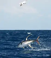 Yellowfins are able to escape most predators because of their speed, swimming at up to 20.8 m/s (47 mph).[9] Unlike most fish, tuna are warm-blooded.[10] Their unique cardiovascular system, warm body temperature, elevated metabolism, and well-developed lymphatic system are all involved in their ability to engage in both rapid bursts and long periods of swimming. When swimming rapidly, a tuna's fins retract into grooves to form a smooth aerodynamic surface and increase its speed, due to a biological hydraulic system involving the lymphatic system.[11][12]