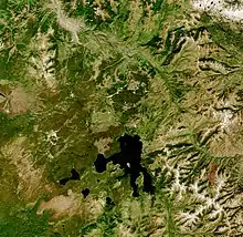 Yellowstone National Park spans an area of 3,468.4 sq mi (8,983 km2),[3] comprising lakes, canyons, rivers, and mountain ranges.[11] Yellowstone Lake is one of the largest high-elevation lakes in North America and is centered over the Yellowstone Caldera, the largest super volcano on the continent. The caldera is considered a dormant volcano. It has erupted with tremendous force several times in the last two million years.[14] Well over half of the world's geysers[15][16] and hydrothermal features[17] are in Yellowstone, fueled by this ongoing volcanism. Lava flows and rocks from volcanic eruptions cover most of the land area of Yellowstone. The park is the centerpiece of the Greater Yellowstone Ecosystem, the largest remaining nearly intact ecosystem in the Earth's northern temperate zone.[18] In 1978, Yellowstone was named a UNESCO World Heritage Site.