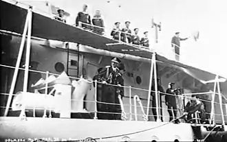In late September 1933, the ship left the Bay of Kotor and sailed through the Turkish Straits to Constanța on the Black Sea coast of Bulgaria, where she embarked King Alexander and Queen Maria of Yugoslavia. She then visited Balcic in Romania and Varna in Bulgaria, before returning via Istanbul and the Greek island of Corfu in the Ionian Sea, arriving back at the Bay of Kotor on 8 October.[14] On 6 October 1934, King Alexander left the Bay of Kotor on board Dubrovnik for a state visit to France, arriving in Marseille on 9 October. He was killed the same day by a Bulgarian assassin, and Dubrovnik conveyed his body back to Yugoslavia, escorted by French, Italian[15] and British ships.[16] Soon after, Vladimir Šaškijević replaced Pavić as captain.[15] In August 1935, Dubrovnik visited Corfu and Bizerte in the French protectorate of Tunisia.[17] In August 1937, Dubrovnik visited Istanbul and the Greek ports of Mudros in the northern Aegean Sea and Piraeus near Athens.[18]
