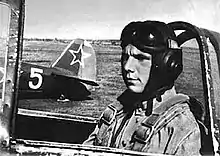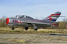 In 1955, Gagarin was accepted to the First Chkalov Higher Air Force Pilots School in Orenburg.[18][19] He initially began training on the Yak-18 already familiar to him and later graduated to training on the MiG-15 in February 1956.[18] Gagarin twice struggled to land the two-seater trainer aircraft, and risked dismissal from pilot training. However, the commander of the regiment decided to give him another chance at landing. Gagarin's flight instructor gave him a cushion to sit on, which improved his view from the cockpit, and he landed successfully. Having completed his evaluation in a trainer aircraft,[20] Gagarin began flying solo in 1957.[12]
