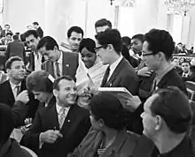 Gagarin gained a reputation as an adept public figure and was noted for his charismatic smile.[57][58][59] On 15 April 1961, accompanied by officials from the Soviet Academy of Sciences, he answered questions at a press conference in Moscow reportedly attended by 1,000 reporters.[60] Gagarin visited the United Kingdom three months after the Vostok 1 mission, going to London and Manchester.[57][61] While in Manchester, despite heavy rain, he refused an umbrella, insisted that the roof of the convertible car he was riding in remain open, and stood so the cheering crowds could see him.[57][62] Gagarin toured widely abroad, accepting the invitation of about 30 countries in the years following his flight.[63] In just the first four months, he also went to Brazil, Bulgaria, Canada, Cuba, Czechoslovakia, Finland, Hungary, and Iceland.[64] Because of his popularity, US president John F. Kennedy barred Gagarin from visiting the United States.[44]