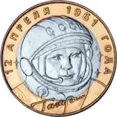 Two commemorative coins were issued in the Soviet Union to honour the 20th and 30th anniversaries of his flight: a one-rouble coin in copper-nickel (1981) and a three-rouble coin in silver (1991). In 2001, to commemorate the 40th anniversary of Gagarin's flight, a series of four coins bearing his likeness was issued in Russia; it consisted of a two-rouble coin in copper-nickel, a three-rouble coin in silver, a ten-rouble coin in brass-copper and nickel, and a 100-rouble coin in silver.[132] In 2011, Russia issued a 1,000-rouble coin in gold and a three-rouble coin in silver to mark the 50th anniversary of his flight.[133]