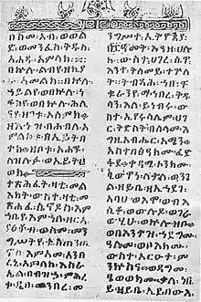 Although he became Emperor in 1434, Zara Yaqob was not crowned until 1436 at Axum, where he resided for three years.[11] During his first years on the throne, Zara Yaqob launched a strong campaign against survivals of pagan worship and "un-Christian practices" within the church. According to a manuscript written in 1784, he appointed spies to search and "smell out" heretics who admitted to worshipping pagan gods such as Dasek, Dail, Guidale, Tafanat, Dino and Makuawze.[2] These heretics were decapitated in public.[2] The spies also revealed that his sons Galawdewos, Amda Maryam, Zar'a Abraham and Batra Seyon, and his daughters Del Samera, Rom Ganayala and Adal Mangesha were heretics and thus they were all executed as a result.[2] He then issued a royal edit ordering every Christian to bear on his forehead a fillet inscribed "Belonging to the Father, and the Son, and the Holy Spirit." And fillets had to be worn on the arms, that on the right being inscribed "I deny the Devil in [the name of] Christ God," and that on the left, "I deny the Devil, the accursed. I am the servant of Mary, the mother of the Creator of all the world." Any man who disobeyed the edict had his property looted and was either beaten or executed.[12]