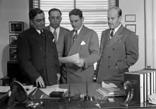 As the riots subsided, the most urgent concern of officials was relations with Mexico, as the economy of Southern California relied on the importation of cheap Mexican labor to assist in the harvesting of California crops.[35] After the Mexican Embassy lodged a formal protest with the State Department, Governor Earl Warren of California ordered the creation of the McGucken Committee (headed by Los Angeles bishop Joseph McGucken) to investigate and determine the cause of the riots.[18] In 1943, the committee issued its report; it determined racism to be a central cause of the riots, further stating that it was "an aggravating practice (of the media) to link the phrase zoot suit with the report of a crime". The governor appointed the Peace Officers Committee on Civil Disturbances, chaired by Robert W. Kenny, president of the National Lawyers Guild to make recommendations to the police.[36] Human relations committees were appointed, and police departments were required to train their officers to treat all citizens equally.[37] Mayor Fletcher Bowron downplayed the role racial prejudice played in the riots and blamed Mexican youth gangs.[37]