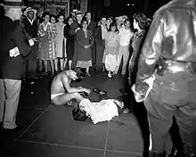 During the next few days, thousands of servicemen and residents joined the attacks, marching abreast down streets, entering bars and movie houses, and assaulting any young Mexican American males they encountered. In one incident, sailors dragged two zoot suiters on-stage as a film was being screened, stripped them in front of the audience, and then urinated on their suits.[18] Although police accompanied the rioters, they had orders not to arrest any, and some of them joined in the rioting. After several days, more than 150 people had been injured, and the police had arrested more than 500 Mexican American civilians on charges ranging from "rioting" to "vagrancy".[24]