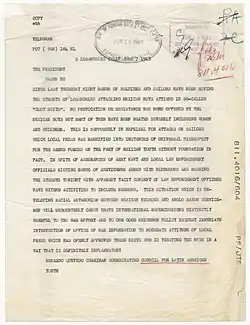 On June 16, 1943, a week after the riots, First Lady Eleanor Roosevelt commented on the riots in her newspaper column. "The question goes deeper than just suits. It is a racial protest. I have been worried for a long time about the Mexican racial situation. It is a problem with roots going a long way back, and we do not always face these problems as we should."[37] The Los Angeles Times published an editorial the next day expressing outrage: it accused Mrs. Roosevelt of having communist leanings and stirring "race discord".[38]