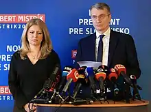In a press conference held on 29 March 2018, Čaputová announced her bid for the Slovak presidency in the 2019 presidential race as the candidate of Progressive Slovakia. Robert Mistrík, another strong contender, withdrew from the race and endorsed her on 26 February 2019.[16] She said she had felt compelled to run for the Presidency after the murder of the investigative journalist Ján Kuciak.[17][18][19]