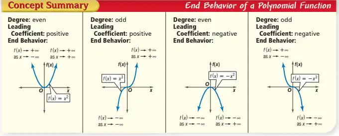 Observe the end behavior. Which direction does x or f(x) lead to? Positive or negative infinity (take note that the functions go infinity and never stop at a certain point)? This is represented by x→+∞ and x→−∞ (x-approaching positive infinity and x-approaching negative identity, respectively). The degree and leading coefficient of a polynomial function determine the end behavior of the polynomial function graph. See Varsity Tutors - End Behavior of a Function (examples) for more examples of end behavior of functions.