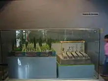 A Chinampa is a floating garden armada in a lake from the Xochimilco region, once Chinampan, of Mexico. This floating garden, still in use, can have an area of up to 10 meters by 200 meters.[2]