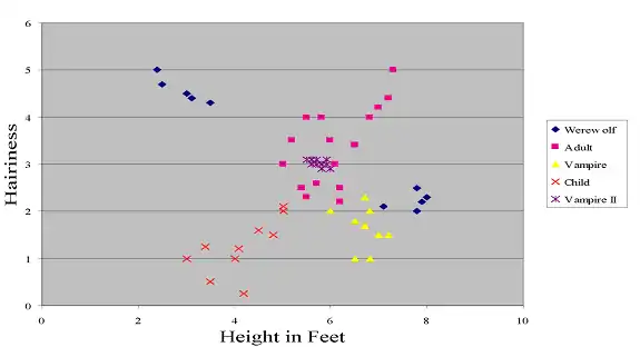 To train your robot you need to select a set of features which the robot can detect and which also can be used to tell the difference between humans, vampires and werewolves. Further, after having your nephew Scotty ruin one of your priceless antique hair dryers, which you keep in the billiard room you decide that the robot should also detect children entering the room. After reading up on the nature of the undead and after taking careful measurement, you realize that the two best features for detection are how tall a person is who is entering the room is and how hairy they are. This works because vampires are tall and completely bald, werewolves are either short and totally covered in fur, or they are the mutant type that are extremely tall, but no more hairy than a human. An adult human is taller than a child and slightly hairier. The chart below shows samples that you took to validate your hypothesis.