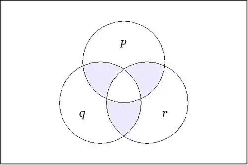 The center cell is the region where all three arguments hold true, so holds true in just the three neighboring cells. In other words: