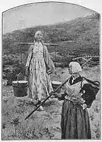 A milkmaid with a shoulder yoke, shown with another female carrying a rake and a wicker backpack, painting by Gari Melchers