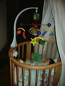 A mobile (órói) hanging over a child.