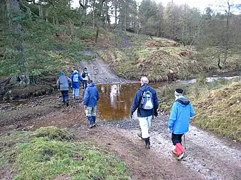 - ford, a river crossing; a location where a river is shallow so it is possible to cross it walking or riding an animal or vehicle