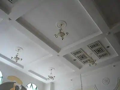 Compare to Tatar түшәм (tüşäm, “ceiling”), Kazakh төсем (tösem, “footcloth, bedding cloth”).
