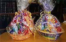 מִשְׁלוֹחַ מָנוֹת / מִשְׁלֹחַ מָנוֹת • (mishlóach manót) m (plural indefinite משלוחי מנות)
