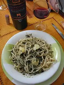 : a sauce made from basil, garlic, pine nuts, olive oil, and cheese.
