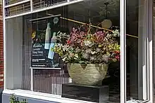 - shop window, display case, show window, a large window behind which items for sale are displayed