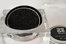 Apparently from Greek χαβιάρι (chaviári), from Byzantine Greek χαβιάρι (khabiári), from Ottoman Turkish خاویار (havyar), from Persian خاویار (xâvyâr). Doublet of كَافْيَار (kafyār) from French or English.