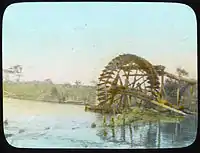 - pipe, conduit, duct, for example such as affiliated to the buckets or scoops of a waterwheel for irrigation