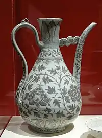 - jug, jar, pitcher, ewer (especially of wine)