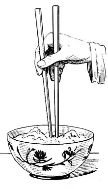 બે હાશી ભાતના વાટકામાં ― be hāśī bhātnā vāṭkāmā̃ ― two chopsticks in a bowl of rice