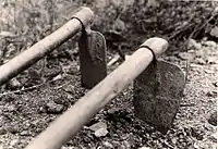 2. Hoe : An agricultural tool consisting of a long handle with a flat blade fixed perpendicular to it at the end.