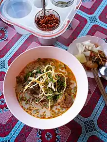 From Shan ၶဝ်ႈသွႆး (khāo sáui) or Northern Thai ᨡᩮᩢ᩶ᩣᨪᩬ᩠ᨿ. Same as ข้าว (kâao, “rice”) + ซอย (sɔɔi, “to slice”).