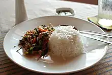 1. a dish of meat stir-fried with holy basil leaves and served with steamed rice.