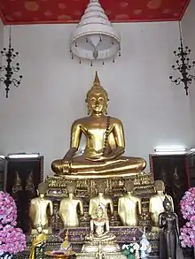 A white chàt is attached to the throne at the front. The throne at the back is flanked by two golden chàt